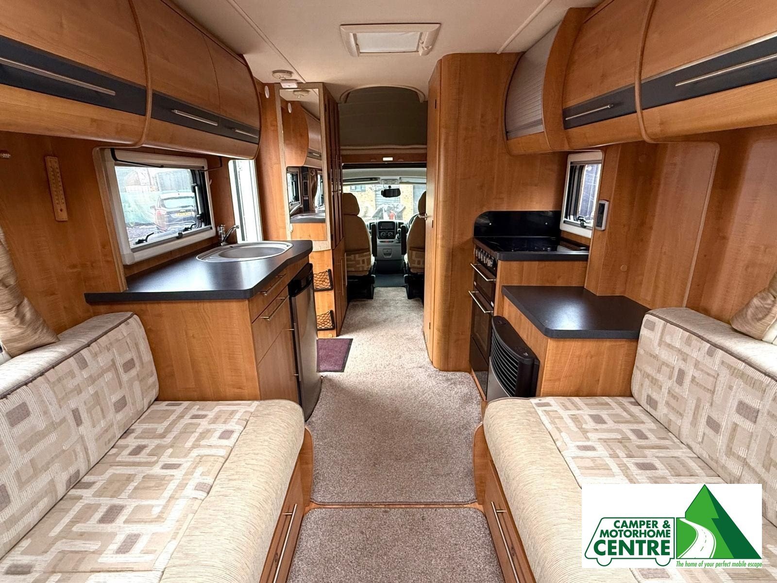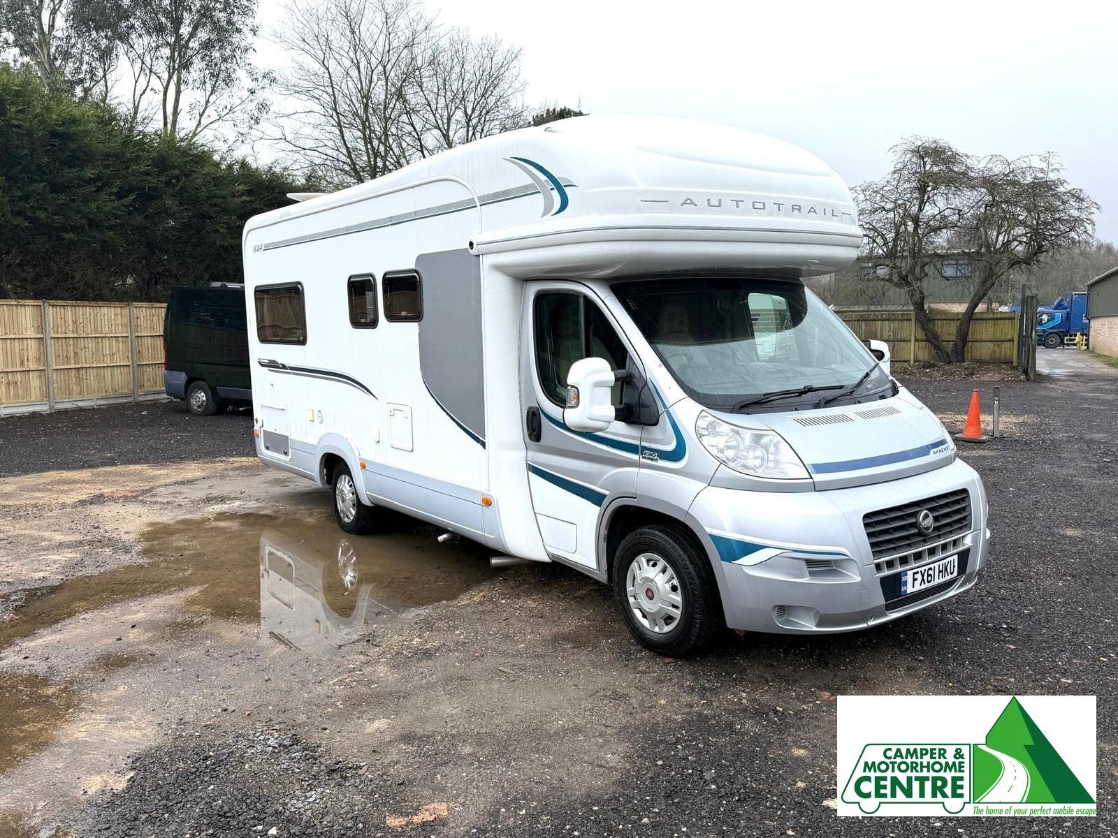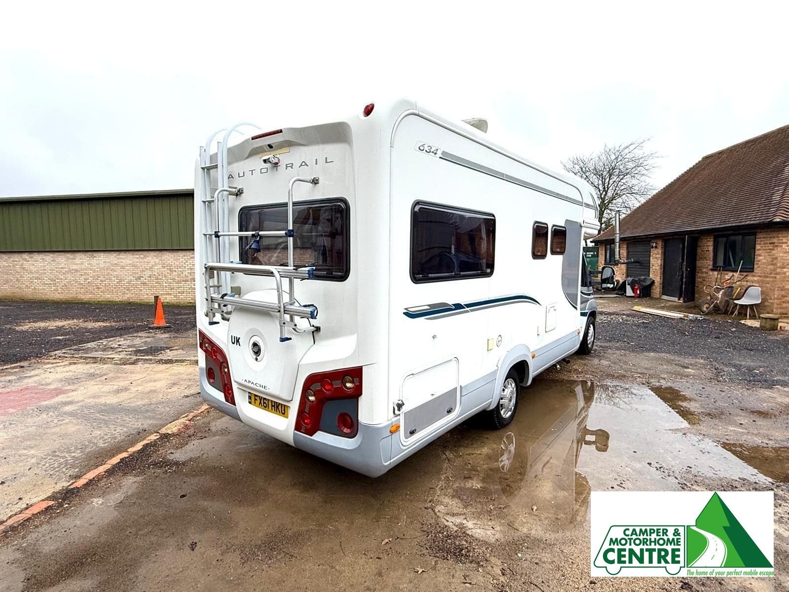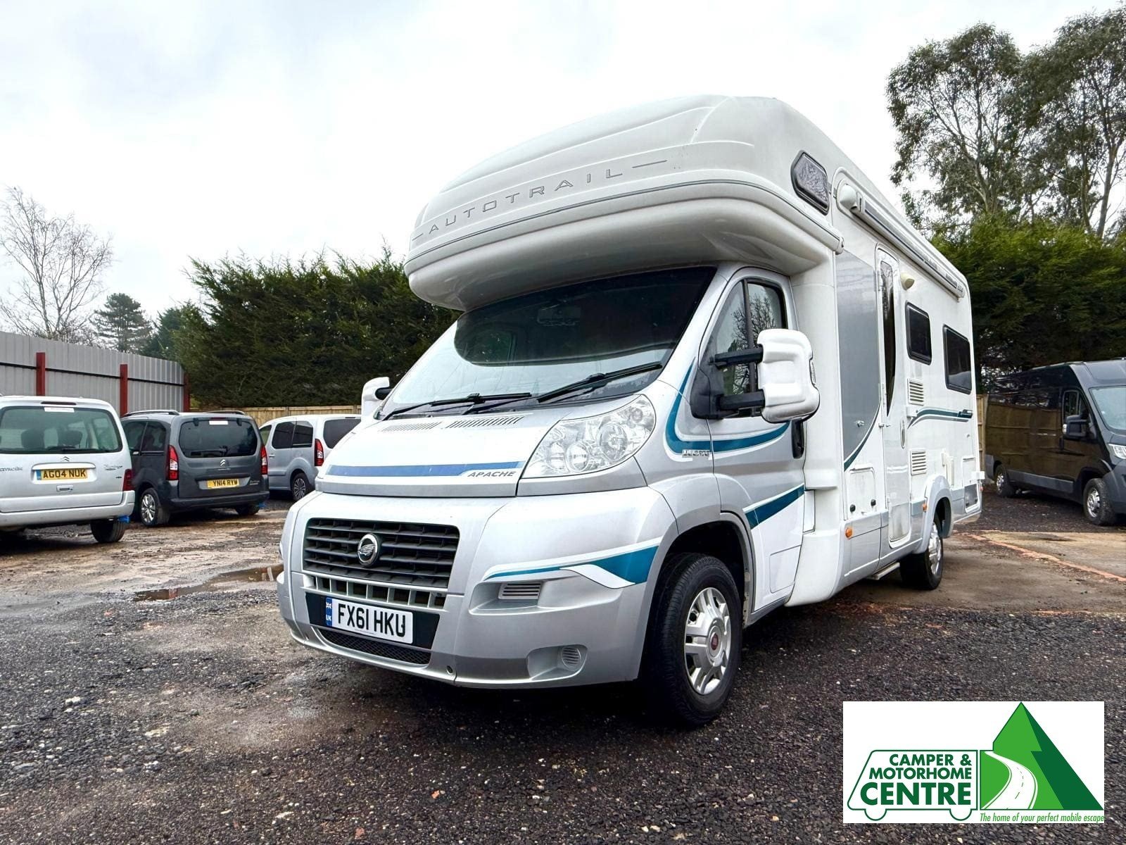 2012 Auto-Trail Apache 634, 4 berth, 2 belted seats, over-cab bed, awning, bike rack, solar panel, reversing camera. Fiat Ducato 2.3, 6 speed, 130 bhp, air con, cruise control, alarm. Uprated to 3850 kg for bigger payload, need C1 licence. If you are looking for a spacious motorhome with lots of storage this might be the one for you. At the front you will find an over-cab bed with ladder. Next a large wardrobe and opposing bathroom with separate shower. the kitchen is presented on both sides with washing up area and fridge, cooker opposite with loads of storage lockers and cupboards. At the rear is a spacious u-lounge with free standing table that turns into a large double bed. -
