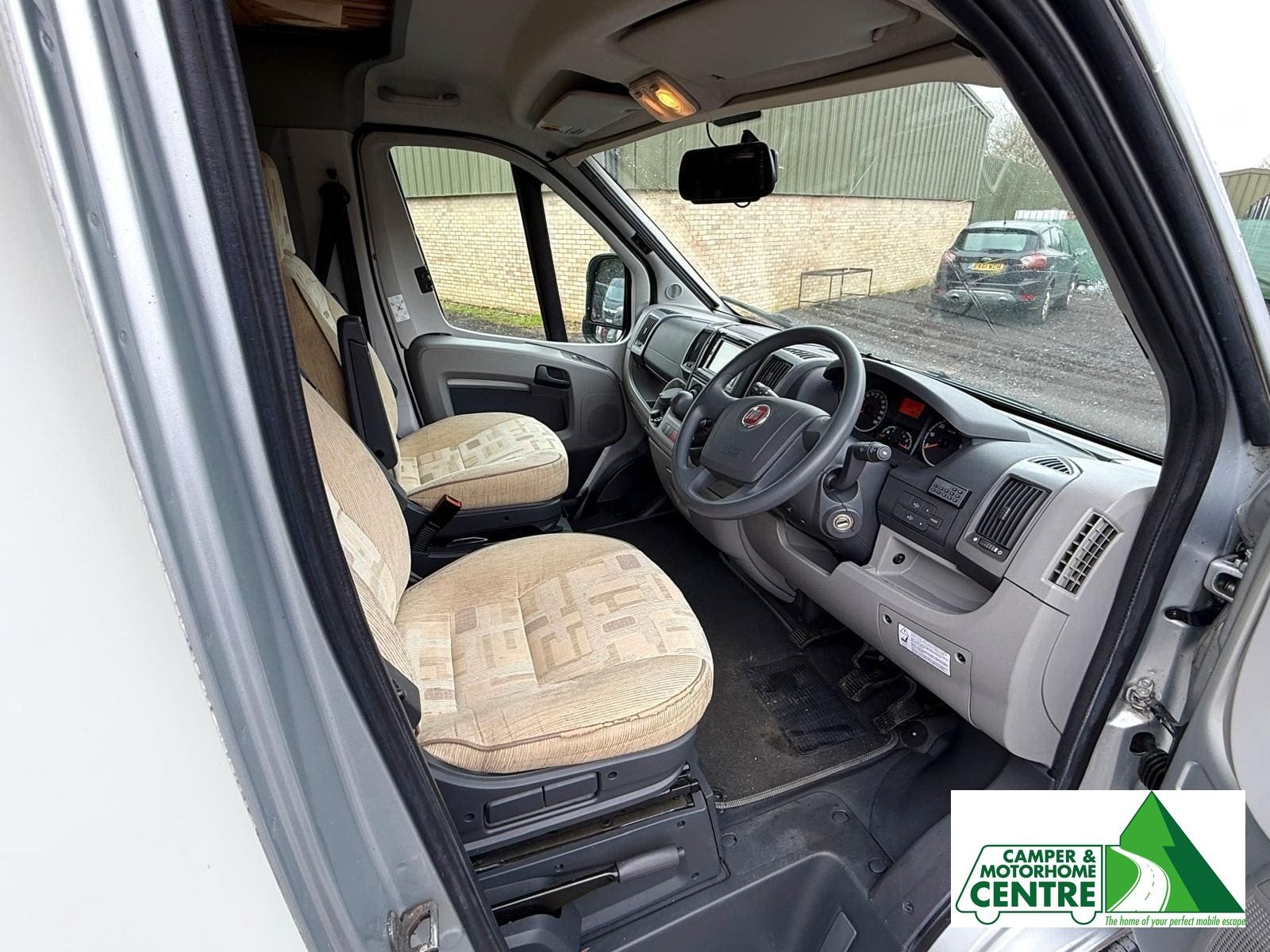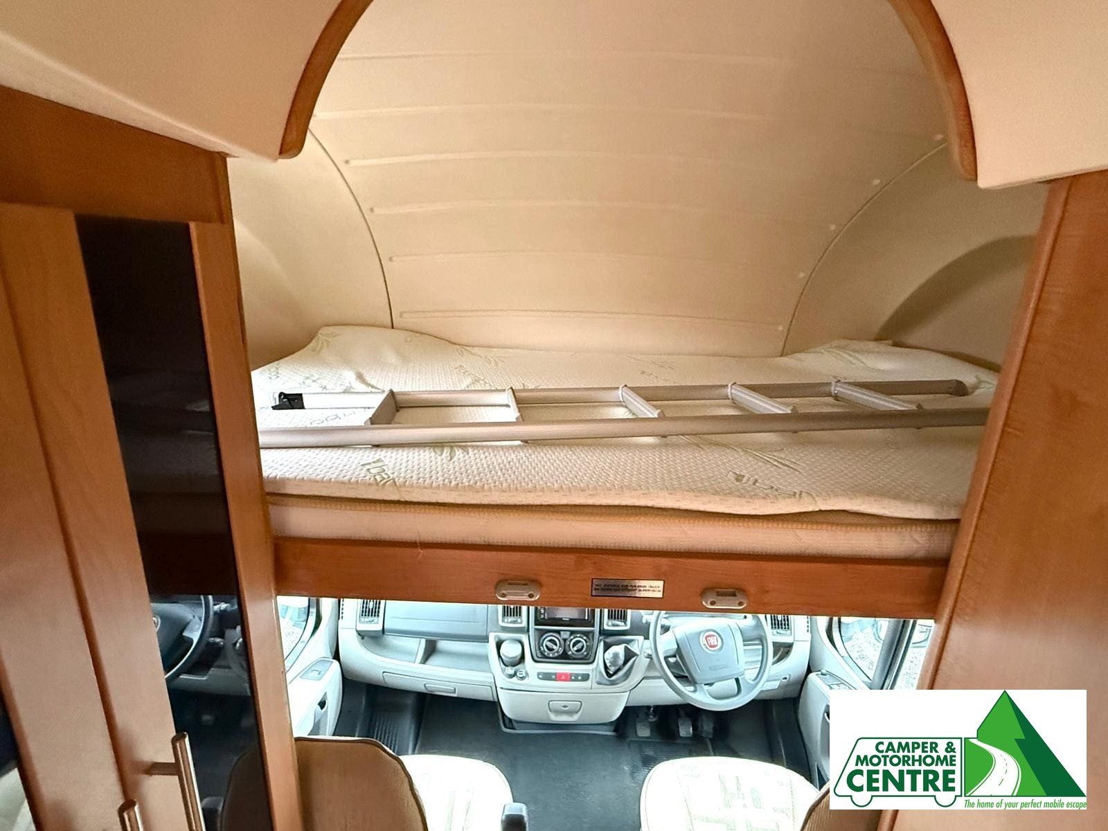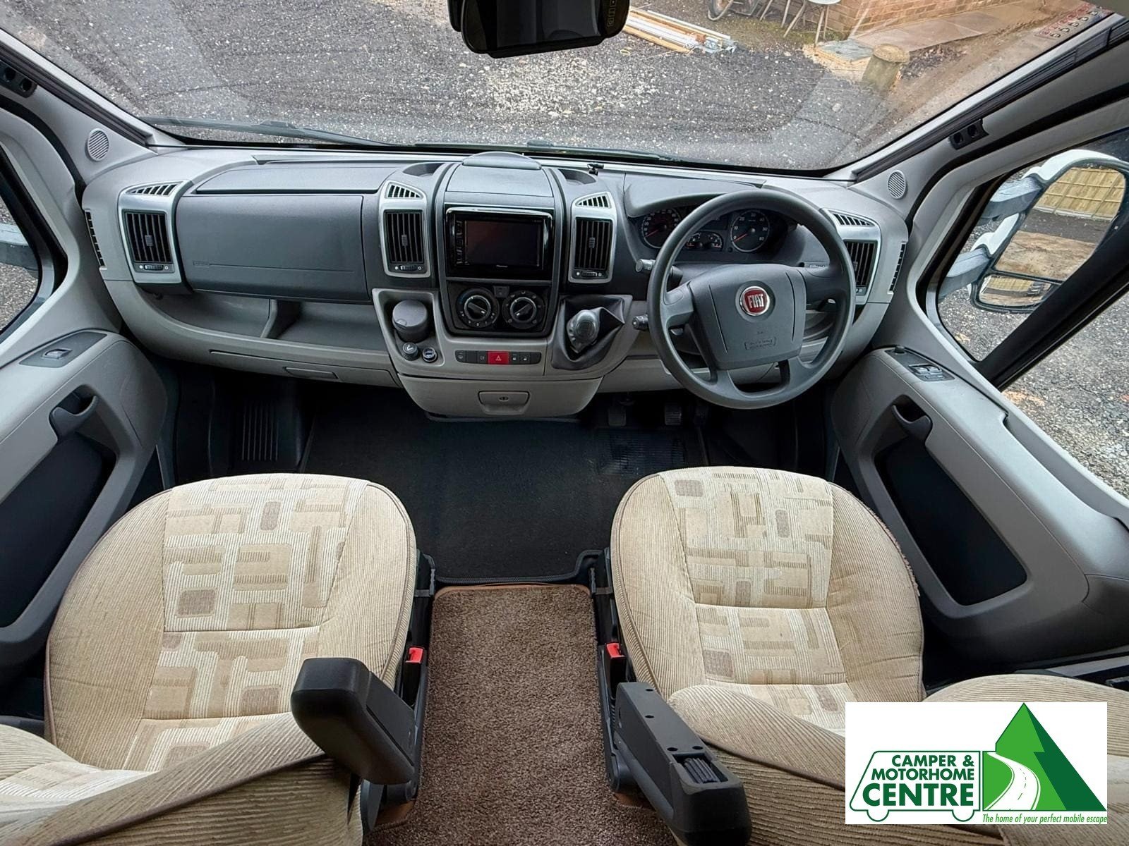 2012 Auto-Trail Apache 634, 4 berth, 2 belted seats, over-cab bed, awning, bike rack, solar panel, reversing camera. Fiat Ducato 2.3, 6 speed, 130 bhp, air con, cruise control, alarm. Uprated to 3850 kg for bigger payload, need C1 licence. If you are looking for a spacious motorhome with lots of storage this might be the one for you. At the front you will find an over-cab bed with ladder. Next a large wardrobe and opposing bathroom with separate shower. the kitchen is presented on both sides with washing up area and fridge, cooker opposite with loads of storage lockers and cupboards. At the rear is a spacious u-lounge with free standing table that turns into a large double bed. -